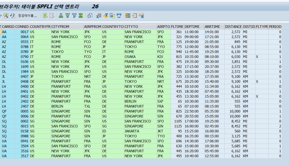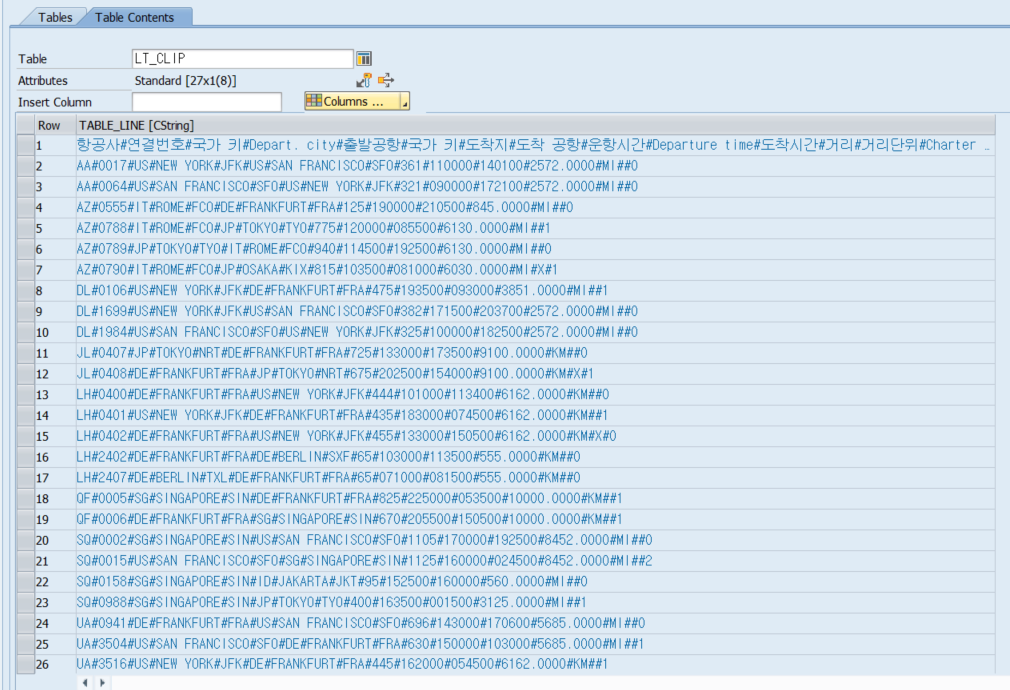 LOOP AT gt_spfli INTO gs_spfli. lv_row = sy-tabix + 1. LOOP AT gt_fields INTO gs_fields. IF gs_fields-fieldname = 'MANDT'. CONTINUE. " MANDT 생략 ENDIF.