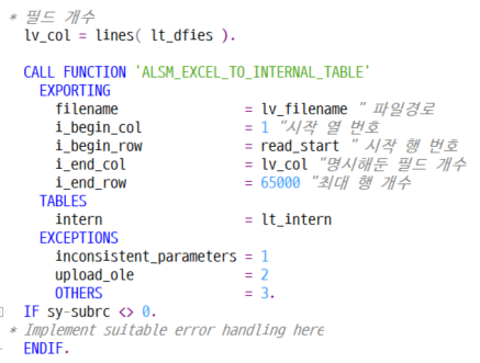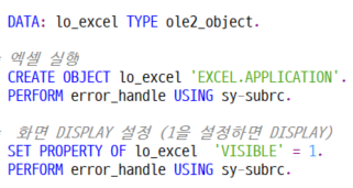 * 엑셀 실행 CREATE OBJECT lo_excel 'EXCEL.APPLICATION'. PERFORM error_handle USING sy-subrc.