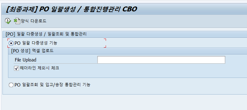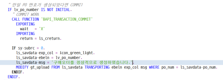 " 만일 PO 번호가 생성되었다면 COMMIT IF lv_po_number IS NOT INITIAL. " COMMIT WORK CALL FUNCTION 'BAPI_TRANSACTION_COMMIT' EXPORTING wait = 'X' IMPORTING return = ls_creturn.