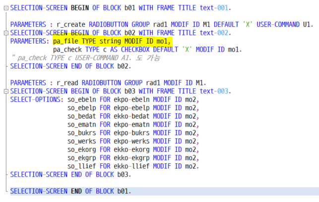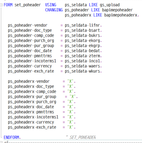 " BAPI LOOP AT pt_seldata INTO ls_seldata. " PO HEADER 문서 설정 IF ls_poheader IS INITIAL. PERFORM set_poheader USING ls_seldata CHANGING ls_poheader ls_poheaderx. MOVE-CORRESPONDING ls_seldata TO ls_savdata. ENDIF.