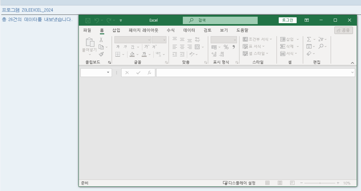 * 화면 DISPLAY 설정 (1을 설정하면 DISPLAY) SET PROPERTY OF lo_excel 'VISIBLE' = 1. PERFORM error_handle USING sy-subrc.