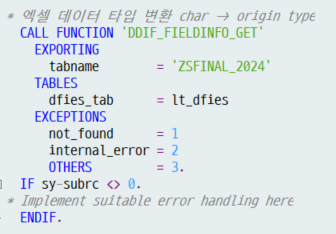 FREE OBJECT lo_excel. FREE OBJECT lo_book. FREE OBJECT lo_books. FREE OBJECT lo_cell. ENDFORM. " EXPORT_EXCEL *&---------------------------------------------------------------------* *& Form ERROR_HANDLE *&---------------------------------------------------------------------* * text *----------------------------------------------------------------------* * -->P_SY_SUBRC text *----------------------------------------------------------------------* FORM error_handle USING pv_subrc TYPE sy-subrc. IF pv_subrc <> 0. MESSAGE 'OLE 자동화 에러' TYPE 'W'. STOP. ENDIF. ENDFORM. " ERROR_HANDLE *&---------------------------------------------------------------------* *& Form GET_FIELDINFO *&---------------------------------------------------------------------* * text *----------------------------------------------------------------------* * --> p1 text * <-- p2 text *----------------------------------------------------------------------* FORM get_fieldinfo . SELECT * INTO CORRESPONDING FIELDS OF TABLE gt_fields FROM dd03m WHERE tabname = 'SPFLI' AND ddlanguage = 3. ENDFORM. " GET_FIELDINFO