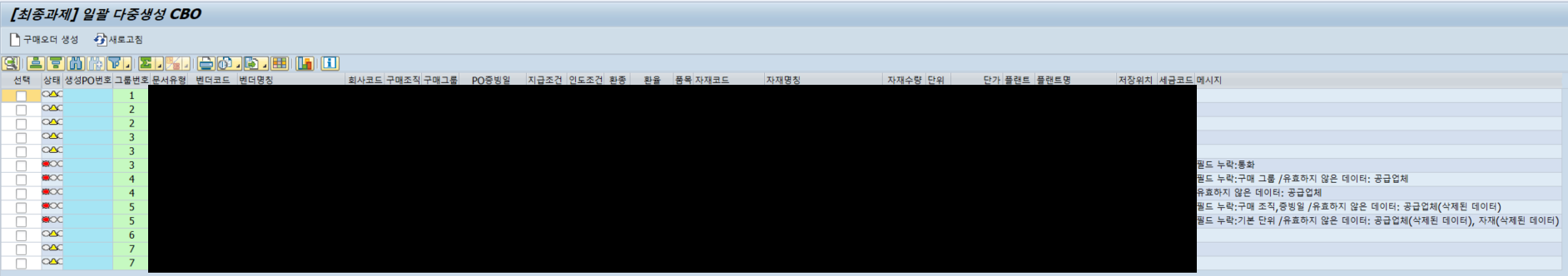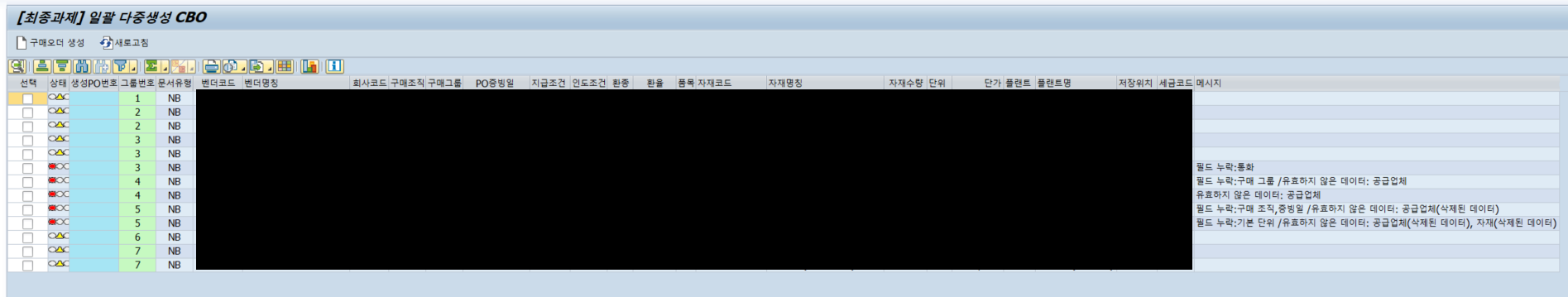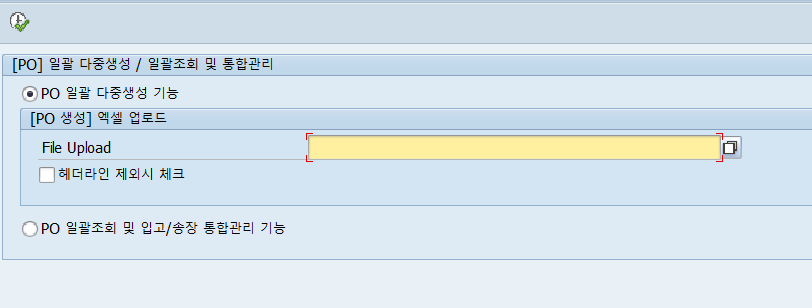 " 에러사항이 있다면 해당 내용으로 메세지 호출 READ TABLE lt_return INTO ls_return WITH KEY type = 'E' id = '06'. IF ls_return-type = 'E'. ls_savdata-exp_col = icon_red_light. ls_savdata-msg = ls_return-message. MODIFY gt_upload FROM ls_savdata TRANSPORTING exp_col msg WHERE po_num = ls_savdata-po_num. ENDIF.