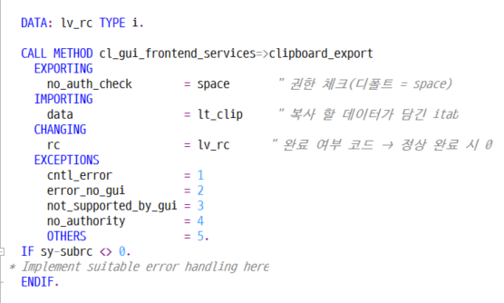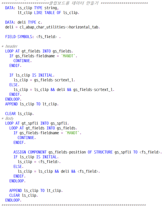 IF gt_spfli IS NOT INITIAL. gv_txt = |총 { lines( gt_spfli ) }건의 데이터를 내보냈습니다.|. PERFORM export_excel_simple. " 간단! WRITE : gv_txt. ENDIF. *&---------------------------------------------------------------------* *& Form ERROR_HANDLE *&---------------------------------------------------------------------* * text *----------------------------------------------------------------------* * -->P_SY_SUBRC text *----------------------------------------------------------------------* FORM error_handle USING pv_subrc TYPE sy-subrc. IF pv_subrc <> 0. MESSAGE 'OLE 자동화 에러' TYPE 'W'. STOP. ENDIF. ENDFORM. " ERROR_HANDLE *&---------------------------------------------------------------------* *& Form GET_FIELDINFO *&---------------------------------------------------------------------* * text *----------------------------------------------------------------------* * --> p1 text * <-- p2 text *----------------------------------------------------------------------* FORM get_fieldinfo . SELECT * INTO CORRESPONDING FIELDS OF TABLE gt_fields FROM dd03m WHERE tabname = 'SPFLI' AND ddlanguage = 3. ENDFORM. " GET_FIELDINFO *&---------------------------------------------------------------------* *& Form EXPORT_EXCEL_SIMPLE *&---------------------------------------------------------------------* * text *----------------------------------------------------------------------* * --> p1 text * <-- p2 text *----------------------------------------------------------------------* FORM export_excel_simple . ***********************클립보드용 데이터 만들기 *********************** DATA: ls_clip TYPE c LENGTH 1000, lt_clip LIKE TABLE OF ls_clip.
