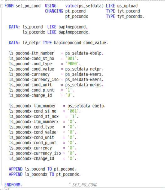 " ITEM 문서 설정 - item & condition PERFORM set_po_item USING ls_seldata CHANGING lt_poitem lt_poitemx. PERFORM set_po_cond USING ls_seldata CHANGING lt_pocond lt_pocondx.