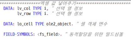DATA: lo_excel TYPE ole2_object, lo_cell TYPE ole2_object, " 셀 객체 변수 lo_books TYPE ole2_object, lo_book TYPE ole2_object.