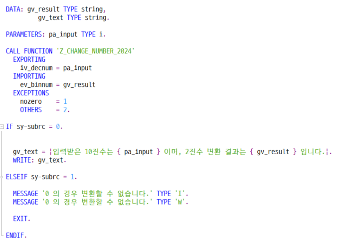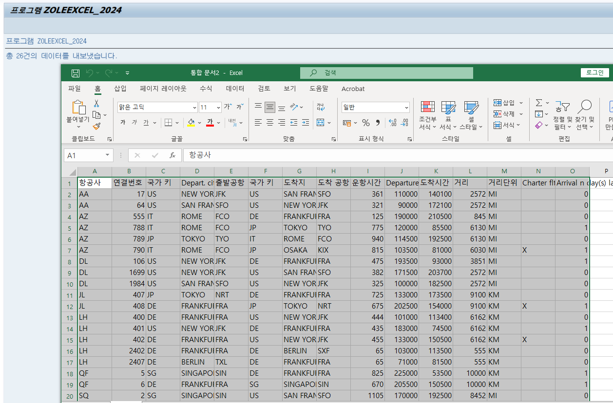 IF gt_spfli IS NOT INITIAL. gv_txt = |총 { lines( gt_spfli ) }건의 데이터를 내보냈습니다.|. PERFORM export_excel. WRITE : gv_txt. ENDIF. *&---------------------------------------------------------------------* *& Form EXPORT_EXCEL *&---------------------------------------------------------------------* * text *----------------------------------------------------------------------* * --> p1 text * <-- p2 text *----------------------------------------------------------------------* FORM export_excel . DATA: lv_col TYPE i, " 선택 열 정보 lv_row TYPE i. " 선택 행 정보