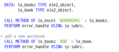 * add a new workbook CALL METHOD OF lo_books 'ADD' = lo_book. PERFORM error_handle USING sy-subrc.